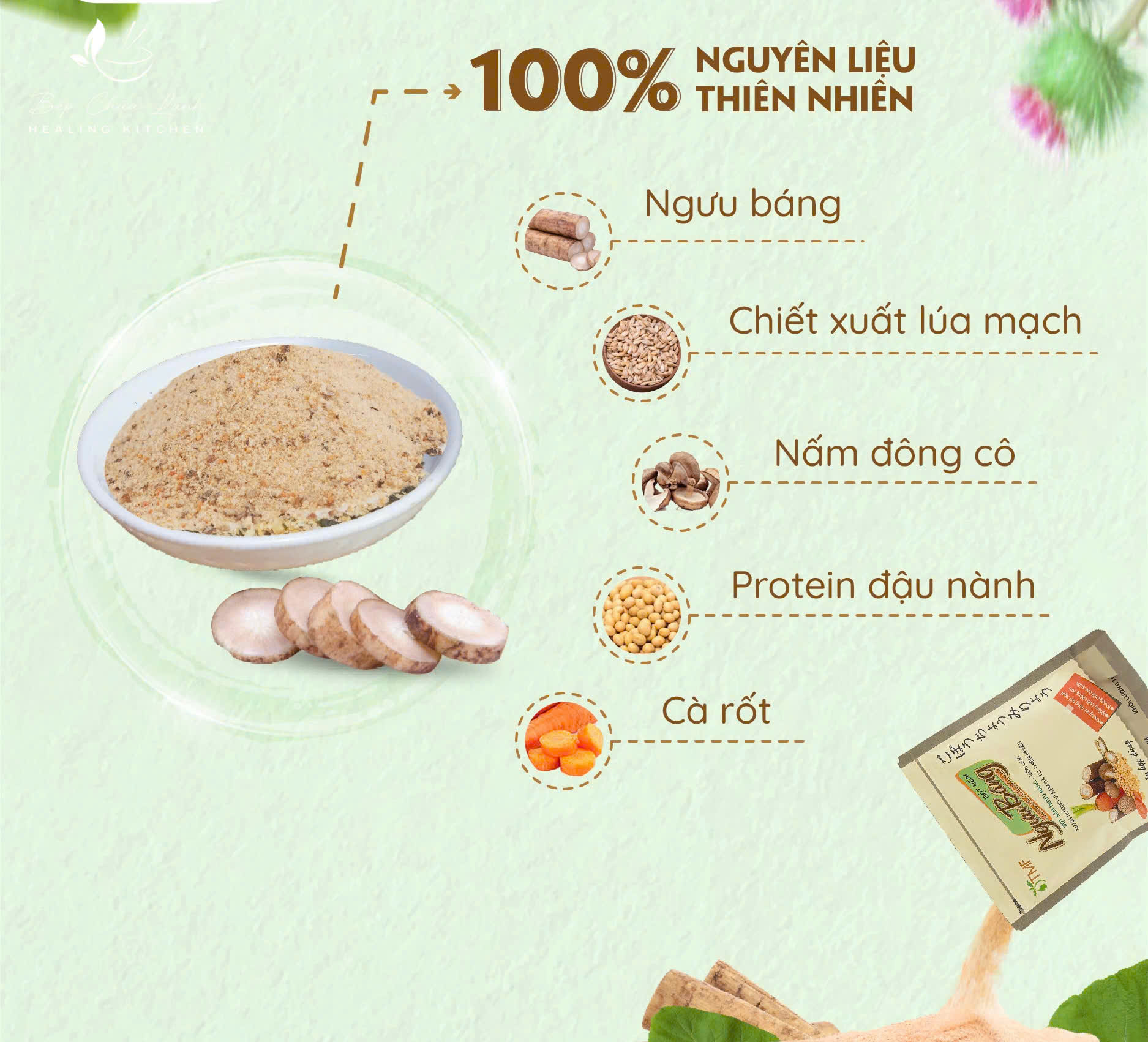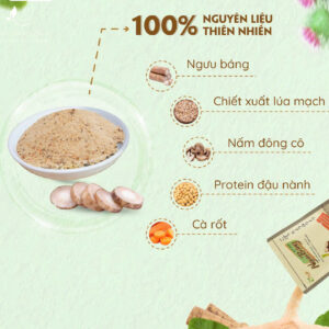 Thành phần dinh dưỡng: Ngưu báng 30%, muối, nấm đông cô, cà rốt, protein đậu nành, chiết xuất lúa mạch, đường vàng.